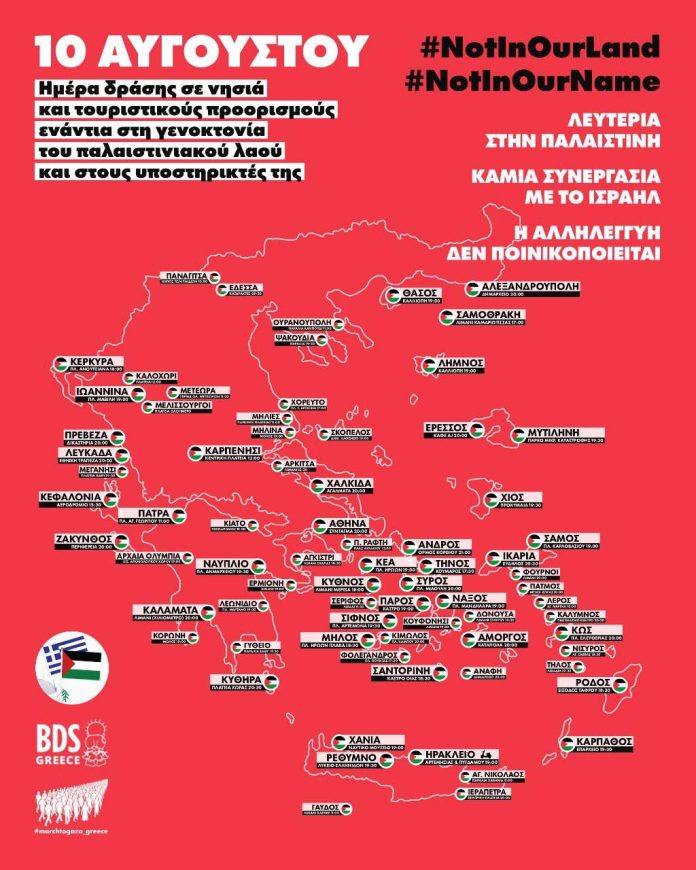 Στις 10 Αυγούστου πραγματοποιήθηκε μέρα δράσης κατά της Γενοκτονίας των Παλαιστινίων σε 110 σημεία σε όλη τη χώρα, σε ηπειρωτική και νησιωτική Ελλάδα. Αξίζει να τονιστεί ότι οι συγκεκριμένες κινητοποιήσεις ήταν ιδιαίτερα μαζικές και συντονισμένες παρά το γεγονός ότι δεν αναδείχτηκαν καθόλου από τα ΜΜΕ και δεν είχαν τη στήριξη των πολιτικών κομμάτων του κοινοβουλίου.