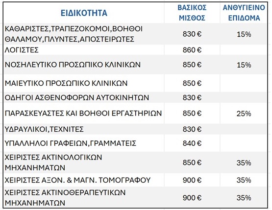 Οι βασικοί μισθοί ειδικοτήτων (χωρίς τα επιδόματα) έχουν αύξηση σε σχέση με την τελευταία Σύμβαση του 2016.  Η σημαντικότερη αύξηση είναι ο μισθός των νοσηλευτών που από 670€ (Σύμβαση 2016) γίνεται 850€ (με την τωρινή απόφαση).