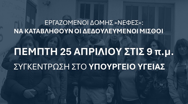 Οι 27 εργαζόμενοι της Δομής Ψυχικής Υγείας «ΝΕΦΕΣ» εργάστηκαν επί ένα ολόκληρο χρόνο απλήρωτοι (από τον Σεπτέμβριο του 2022 ως τον Αύγουστο του 2023). Η Δομή χρηματοδοτείται αποκλειστικά από το Υπουργείο Υγείας που είναι και ο εποπτεύον φορέας. Το Υπουργείο Υγείας είχε διακόψει την χρηματοδότηση για ένα χρόνο λόγω διαχειριστικών ελέγχων. [Ανακοίνωση ΕΔΩ]